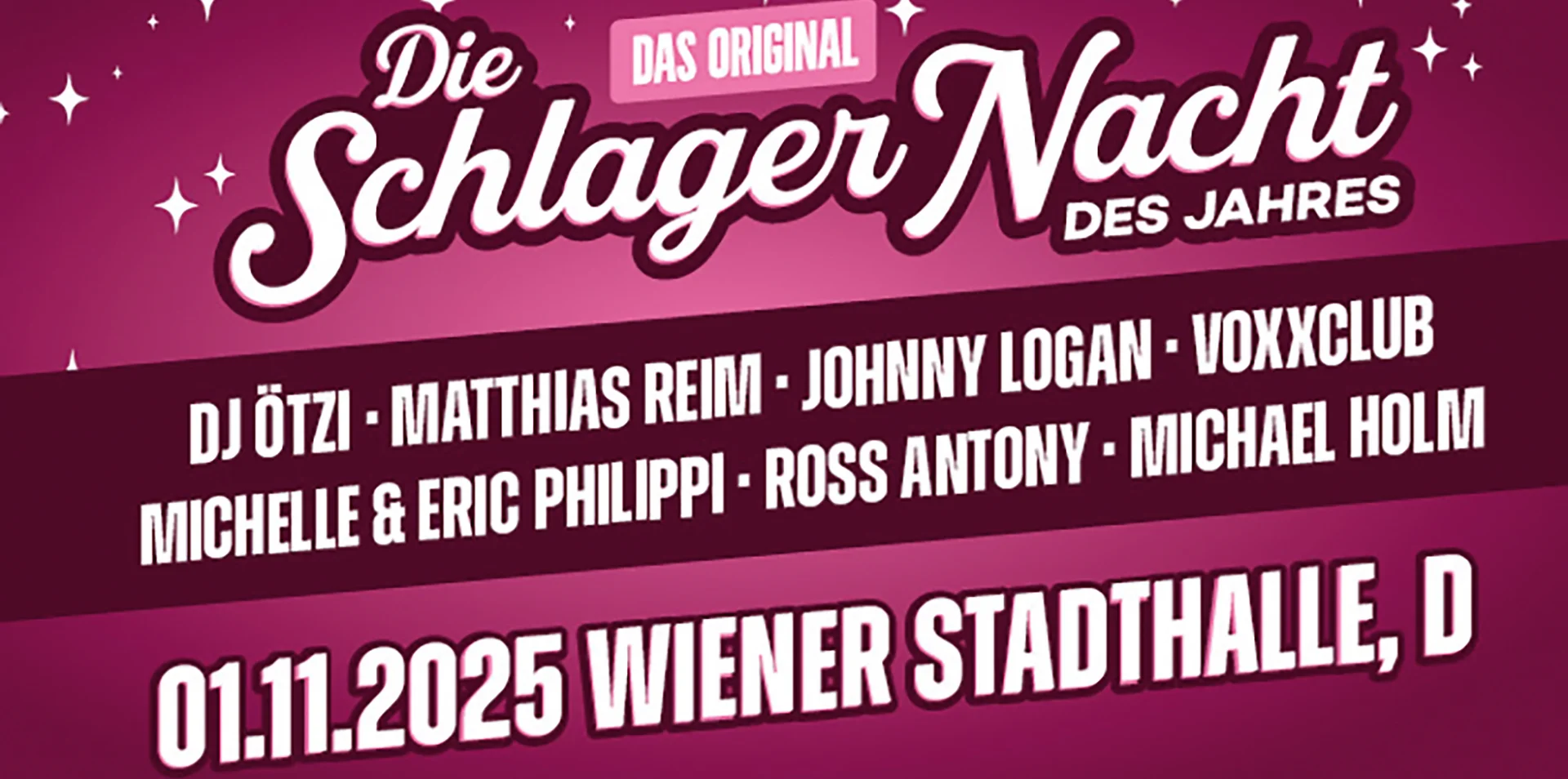 Die Schlagernacht des Jahres 2025 - DAS ORIGINAL kehrt nach Wien zurück und präsentiert das Who’s Who der deutschsprachigen Schlagerszene. Mitreißende Top-Acts, gefeierte Stars und beliebte Stimmungsmacher stehen auf der Bühne und garantieren ein unvergessliches Erlebnis für alle Schlagerfans. Jede:r Künstler:in bringt seine eigene unverwechselbare Note mit, doch alle teilen eine gemeinsame Leidenschaft: die Liebe zur Musik, die in ihren Auftritten lebendig wird.