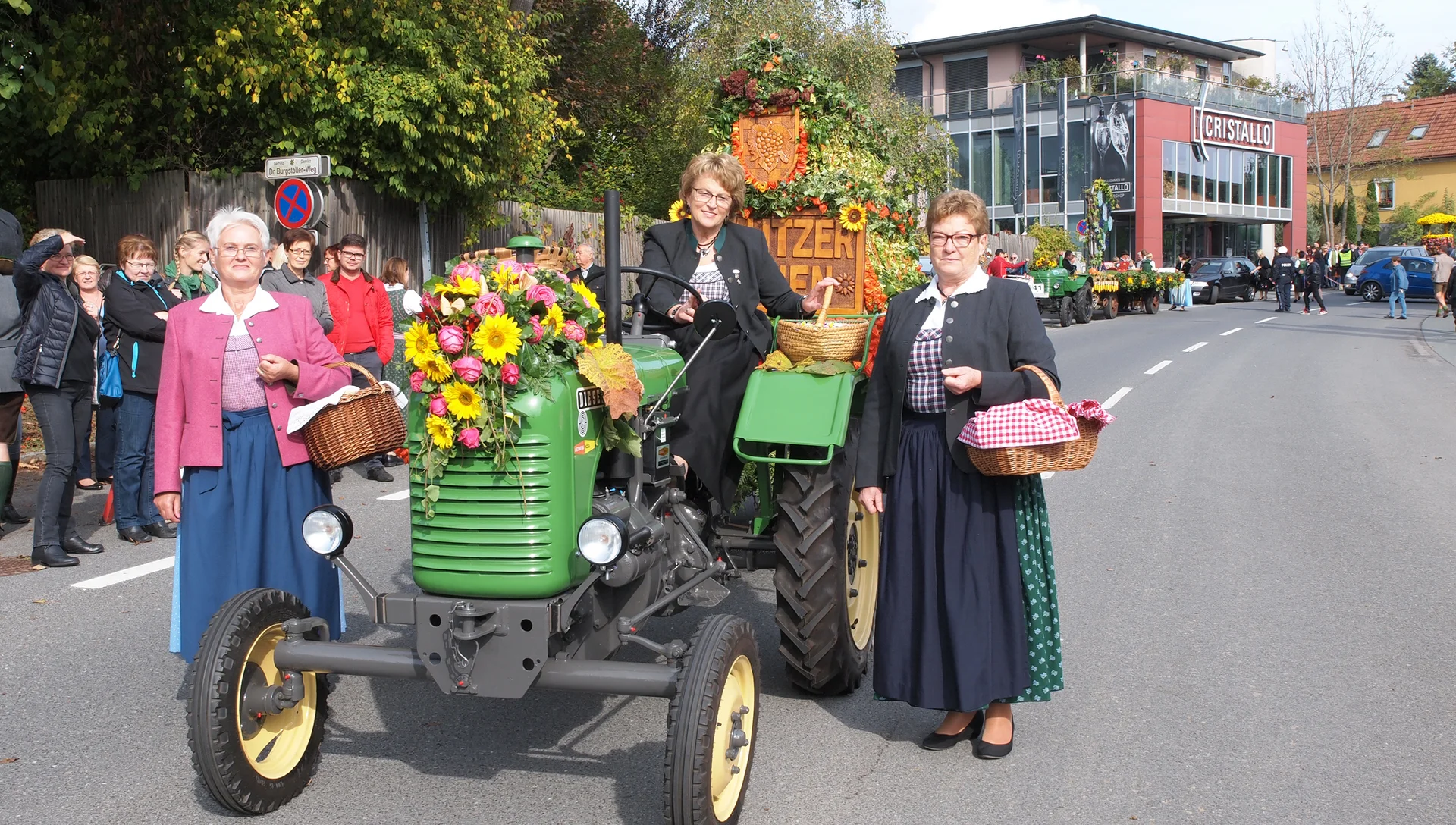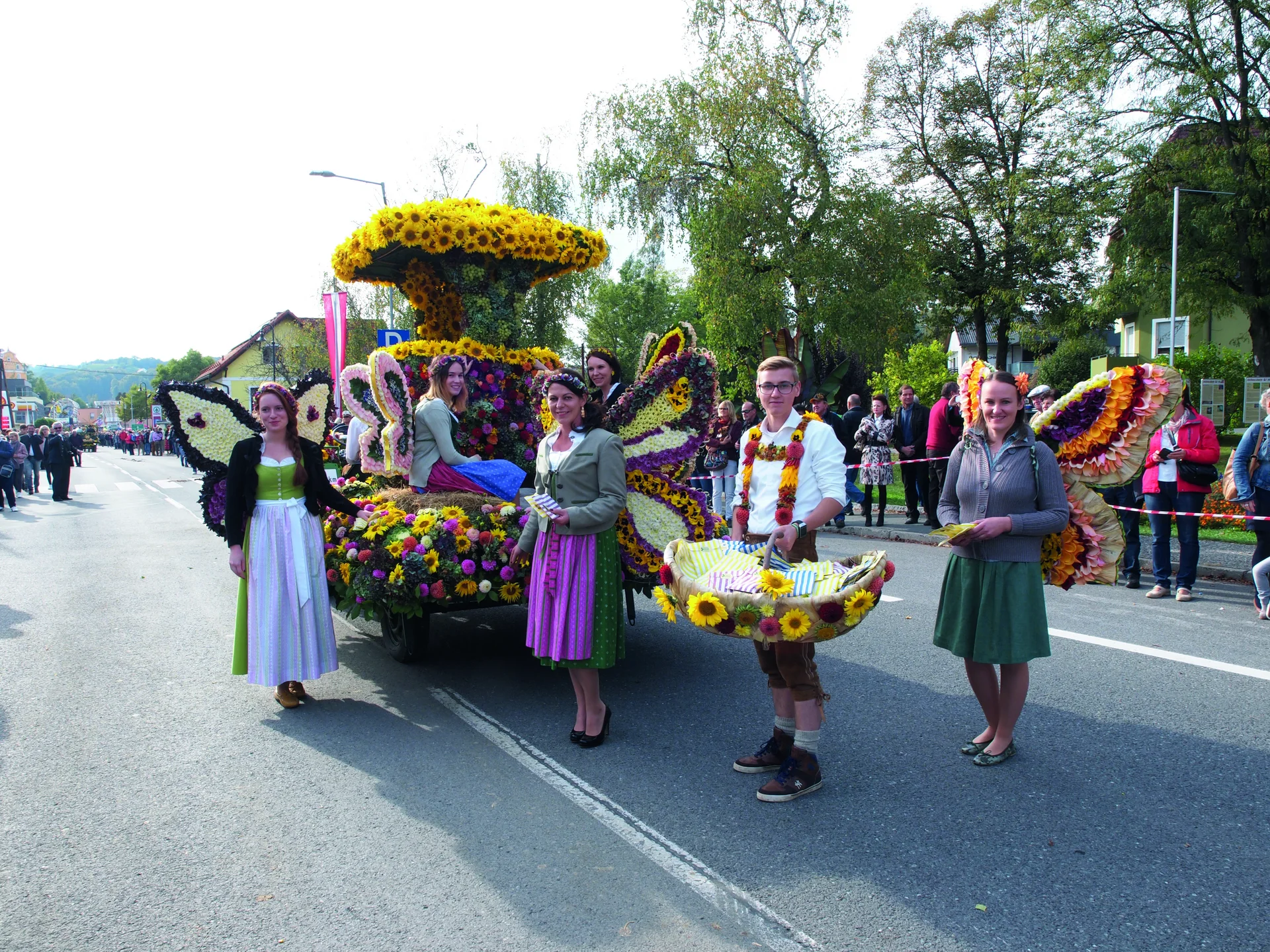 Festlich geschmückte Kutschen, eine pompöse Erntekrone, Musikkapellen aus verschiedenen Bundesländern, Weinhoheiten und Trachtengruppen sowie buntgestaltete Festwägen begeistern die Gäste.