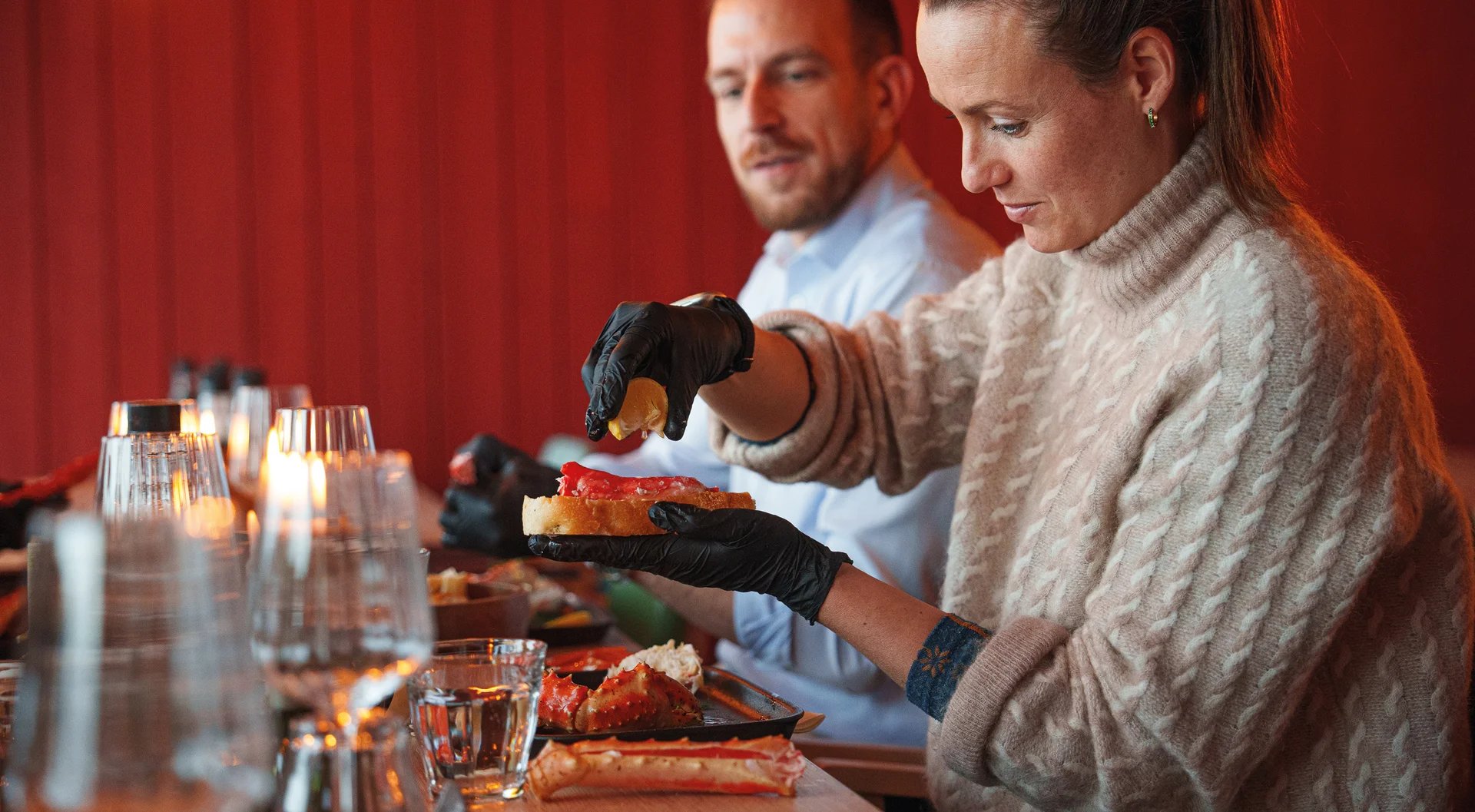 Schließlich wird eine frisch gekochte Königskrabben-Suppe als Vorspeise und die Königskrabben-Beine zusammen mit Brot, Butter, Zitronen und Mayonnaise als Hauptspeise serviert. Kaffee, Tee und Wasser sind inbegriffen, Getränke können separat erworben werden.