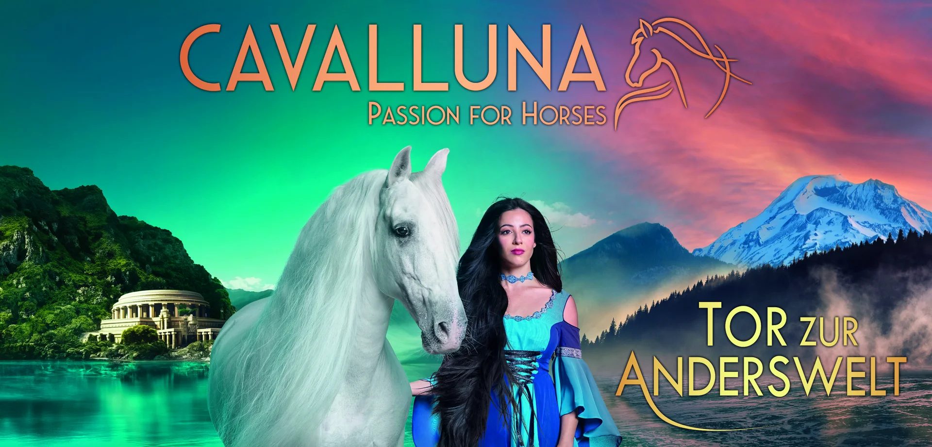 CAVALLUNA „Tor zur Anderswelt“ entführt Sie in geheimnisvolle Welten voller Magie und Abenteuer. Lassen Sie sich von meisterhafter Reitkunst und einer märchenhaften Geschichte verzaubern! Freuen Sie sich auf fröhliche Comedy, actionreiches Trickreiten und beeindruckende Freiheitsdressur, ergänzt durch ein internationales Tanzensemble, berührende Musik und traumhafte Kulissen.